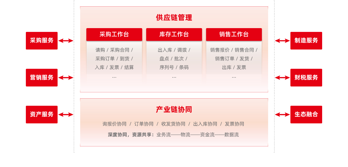 供應鏈云服務,以采購、庫存、銷售服務為核心,通過與采購云、營銷云、財務云、制造云深度融合,實現敏捷供應,產供銷、業財稅一體化高效協同